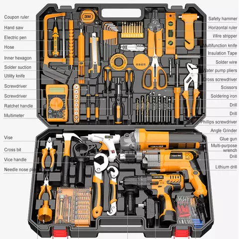 Electric Drill, Tape measure, test pencil, Hand saw, Hose, tin suction device, The knife, Internal hexagonal wrench, Multi functional knife, Insulating tape, scissors, Level ruler, Safety hammer, water pump pliers, A multimeter, Screwdriver, Drill bit, Flat screwdriver, Electric iron, vice, vise, Claw forceps, Glue gun, Angle grinder, Electric drill, sub-controller, Tapper, 45 in one screwdriver set, Angle grinder handle, Charger, screw box, Cruciform, Screwdriver head * 10, Drill bit * 3, Drill bit *4, Cross screwdriver, Solder wire, Ratchet handle, Hexagon wrench head * 8, Universal wrench, Wire stripper, Needle nose plierstool includes