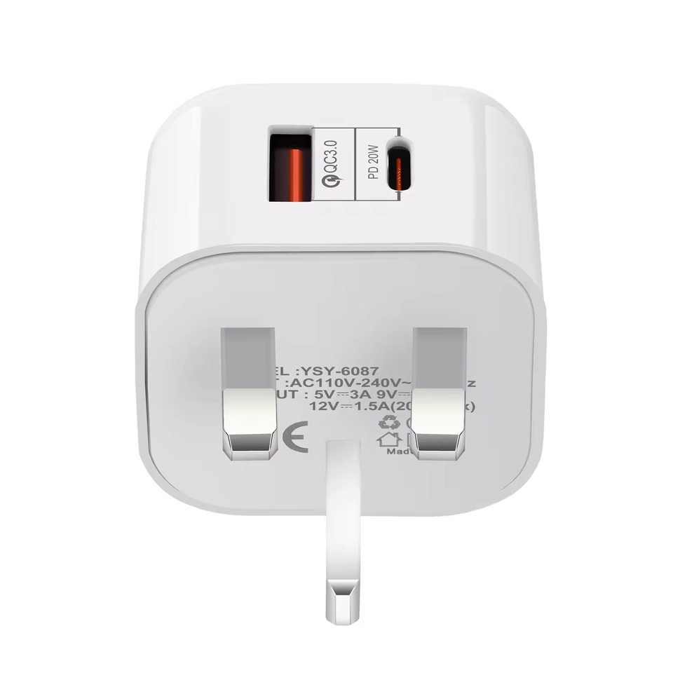 38W UK Charger PD 20W Charger Dual Port Type-C+QC3.0 USB Wall Charger for iPhone