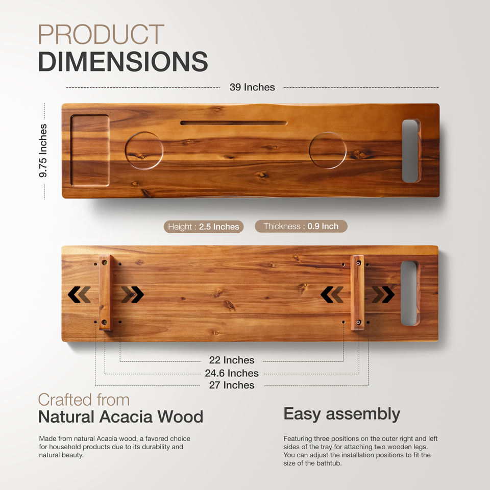 39\" Acacia Wood Bath Tray with Book Tablet Wine Glass Cup Holder Bathroom Organizer for Bathtub Tub Premium Bathroom Sets