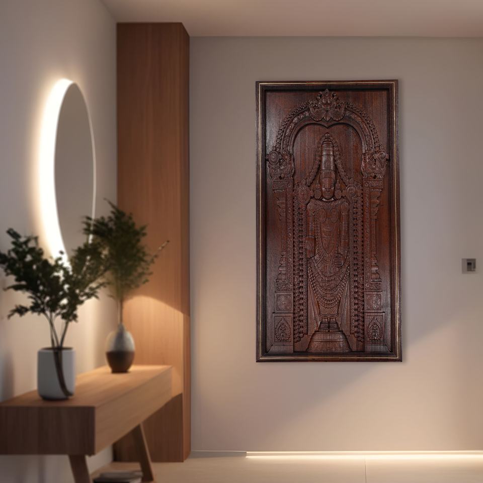 3D Carved Tirupati Balaji Wooden Frame Mahogany Wood Brass Inlay Oil Finish Hindu Religious Wall Hanging