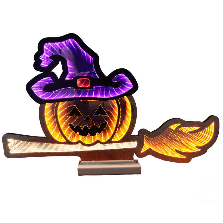 3D Infinity Mirror Halloween Lamp-Glowing Pumpkin with Witch Hat & Broom LED Plastic Home/Party Table Decor