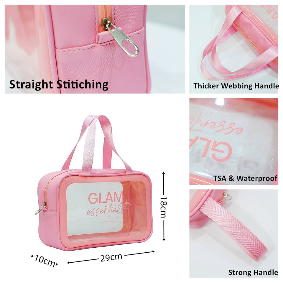 3pc Set Pink TSA Cosmetic Travel Bag Set Clear Makeup Bag Organize Portable Handle Wash Bag S/M/L