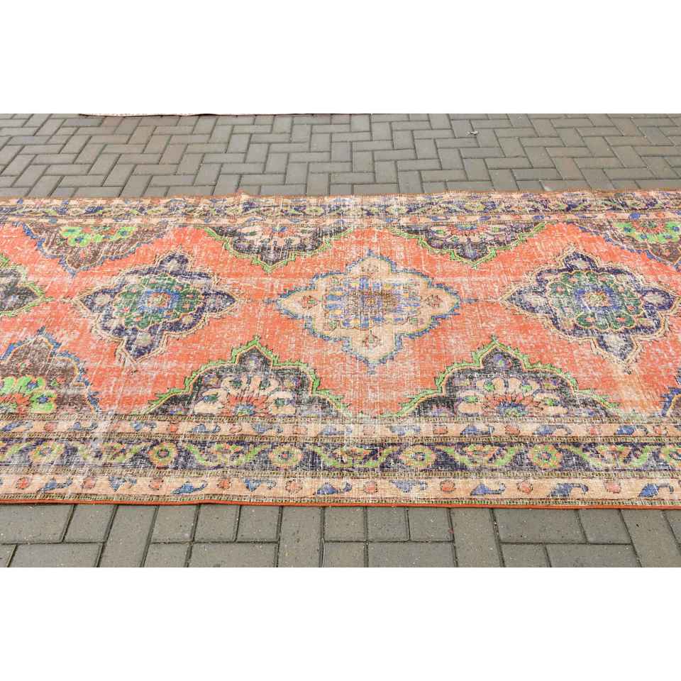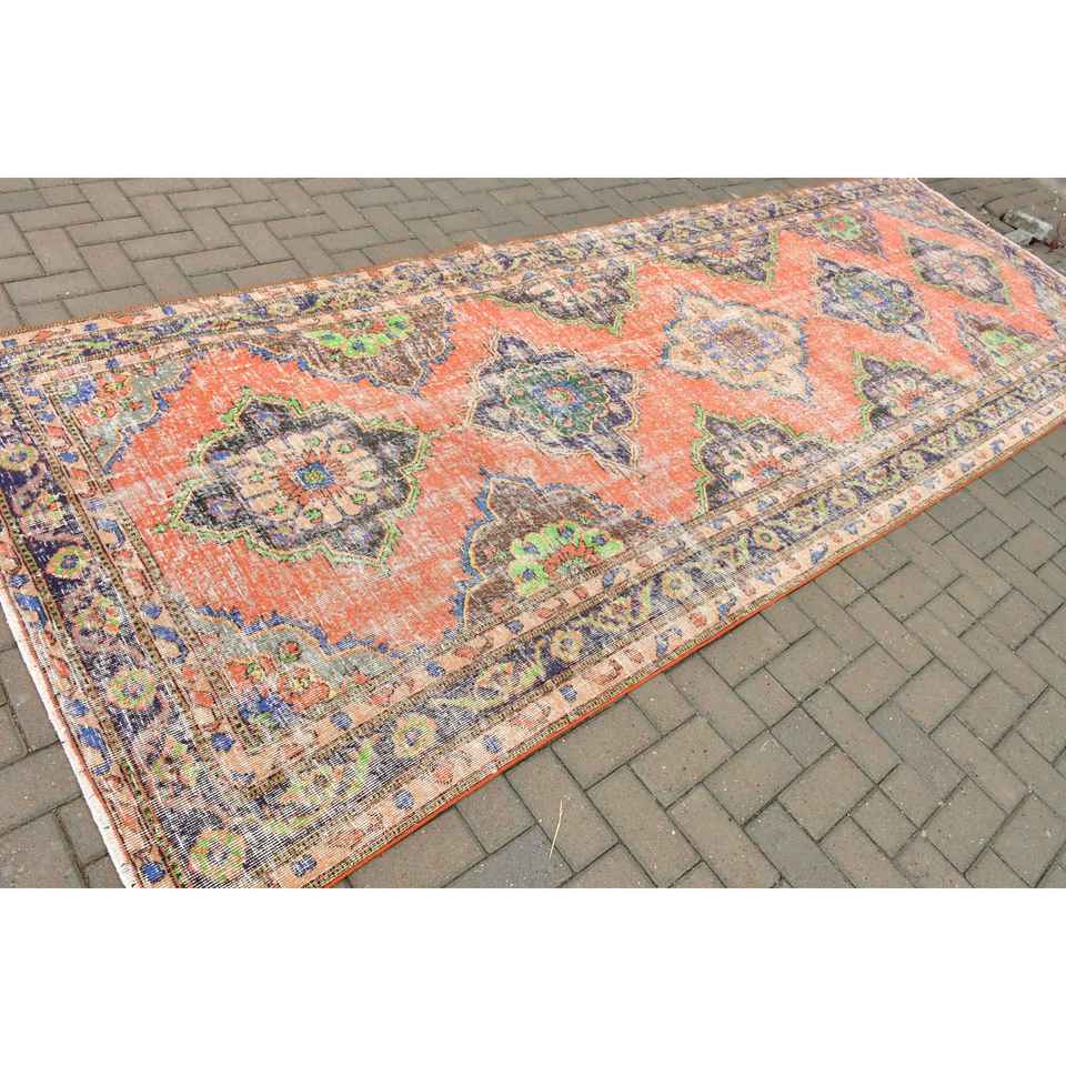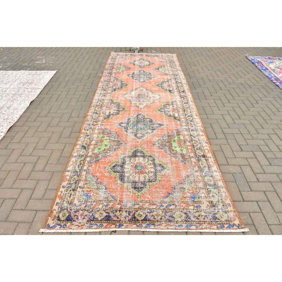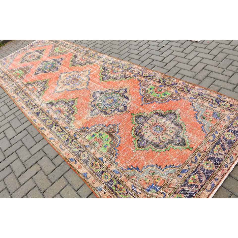 4.7x13.2 ft Turkish Rug, Vintage Rug, Red Floral Wool Rug