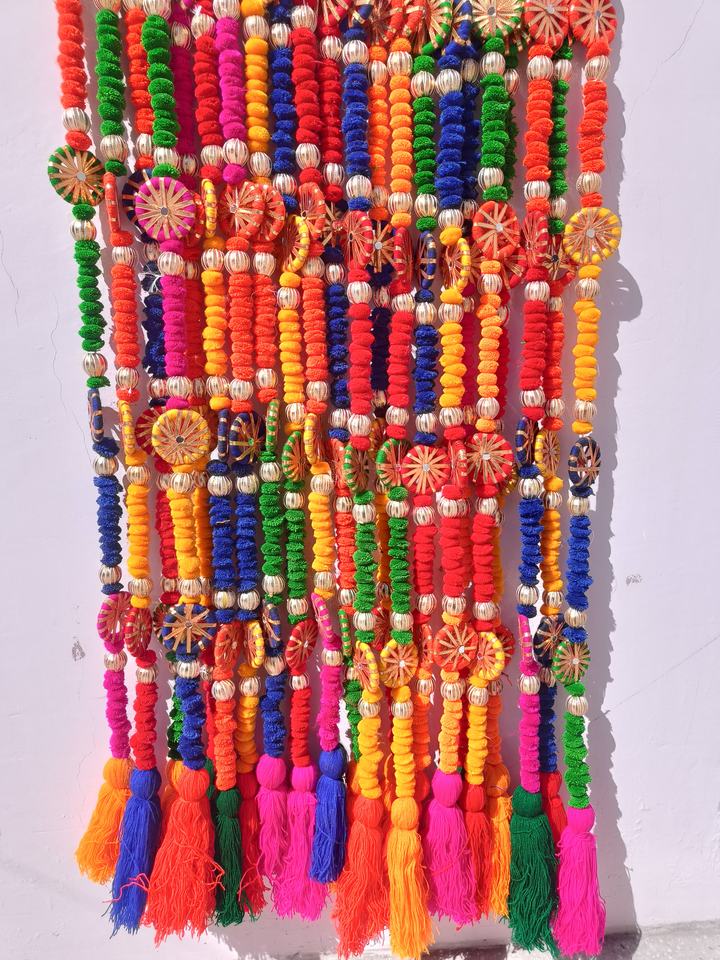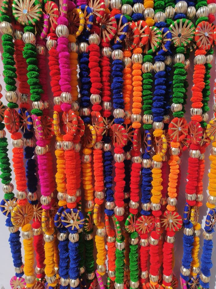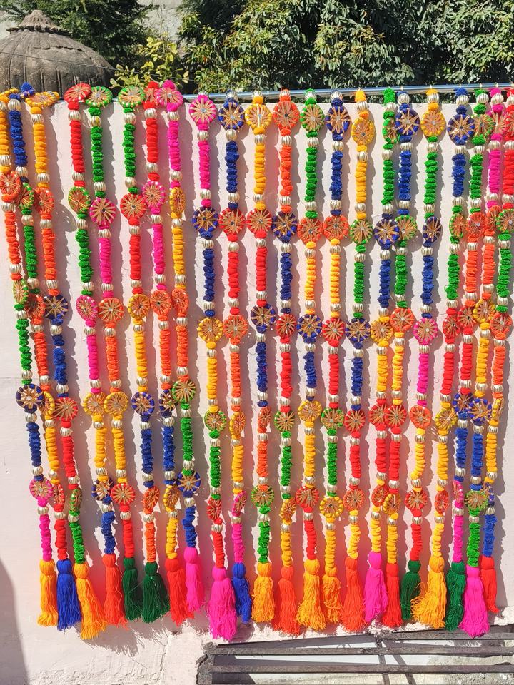 4 Feet Multi Color Pom Pom With Beads Wall Hanging Decoration Chakri Mirror Work Woolen Tassel Garlands For Any Event Decor