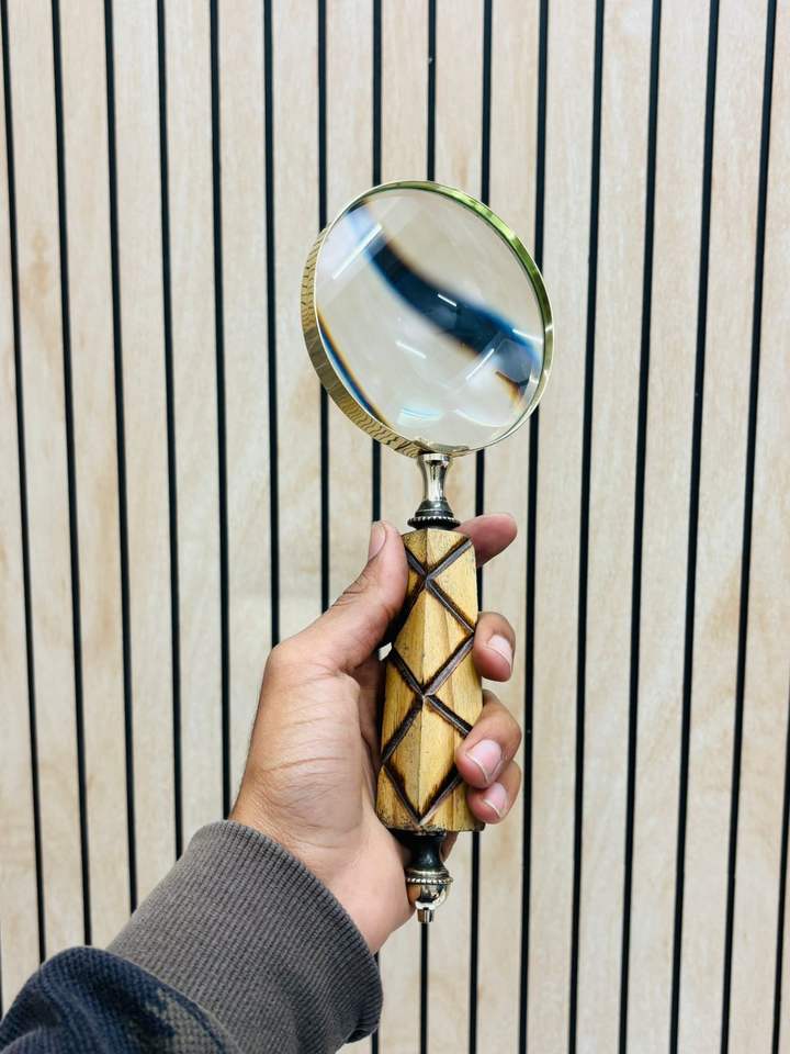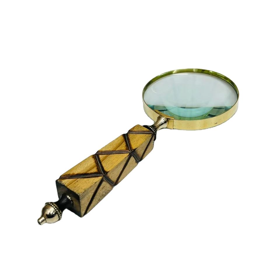 4'' Handheld Magnifying Glass with Geometric Carved Wooden Handle & Brass Frame | Optical Glass Reading Magnifier