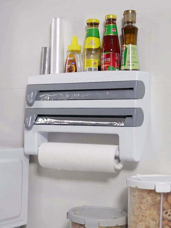 4 In1 Paper Hanger Cling Film Storage Rack Film Roll Holder Cutter Wall Mounted Plastic Kitchen Towel Foil Dispenser Tools