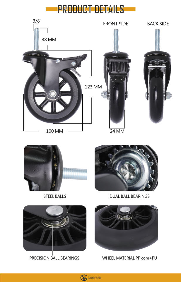 4 Inch PU Caster Wheel 3/8" Threaded Stem Swivel Casters with Brake PP Core Precision Ball Bearings Caster Wheel