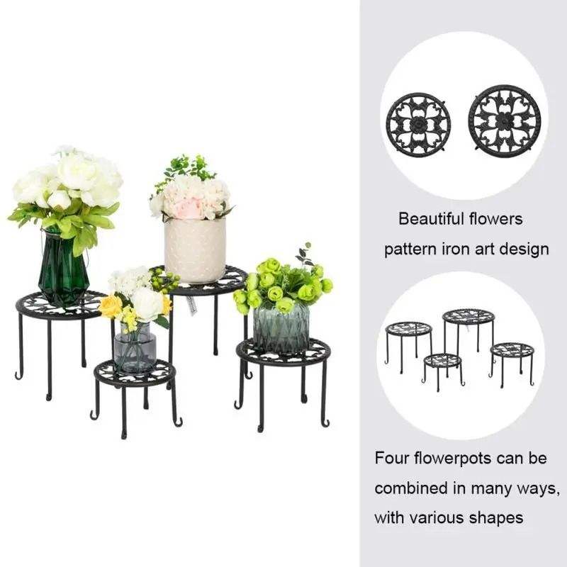 4-Pack Matte Black Durable Metal Flower Pot Holders with Floral Design Round Indoor Home Garden Decorative Plant Stands