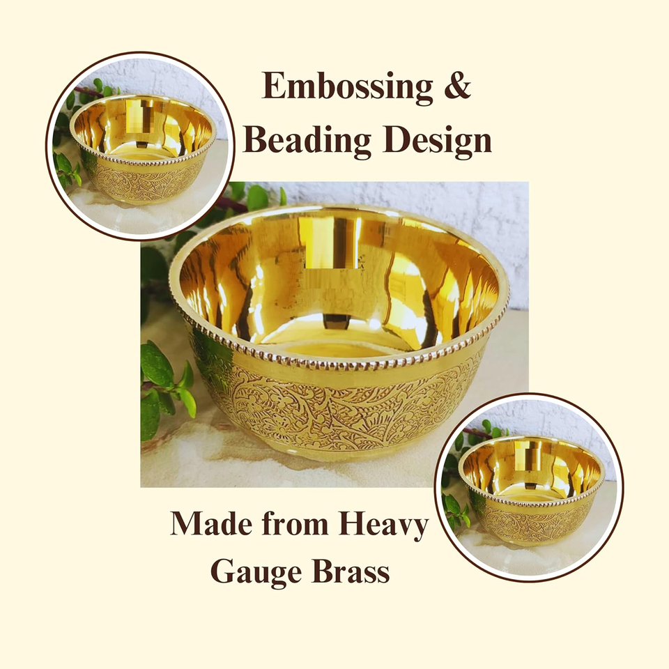 4-Piece Brass Golden Flower Printed Bowls Set 250 ML Highly Durable Dish for Serving Vegetables Curd Salad Dessert Curry Gift