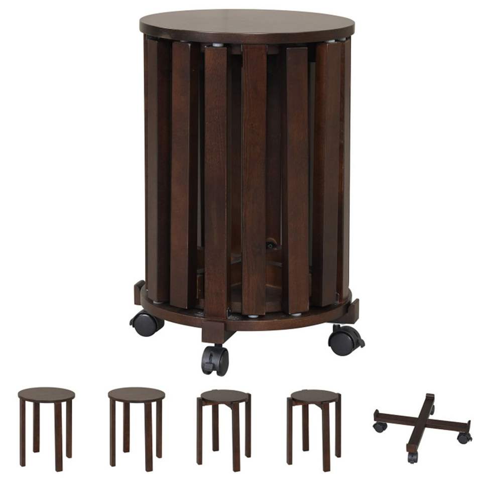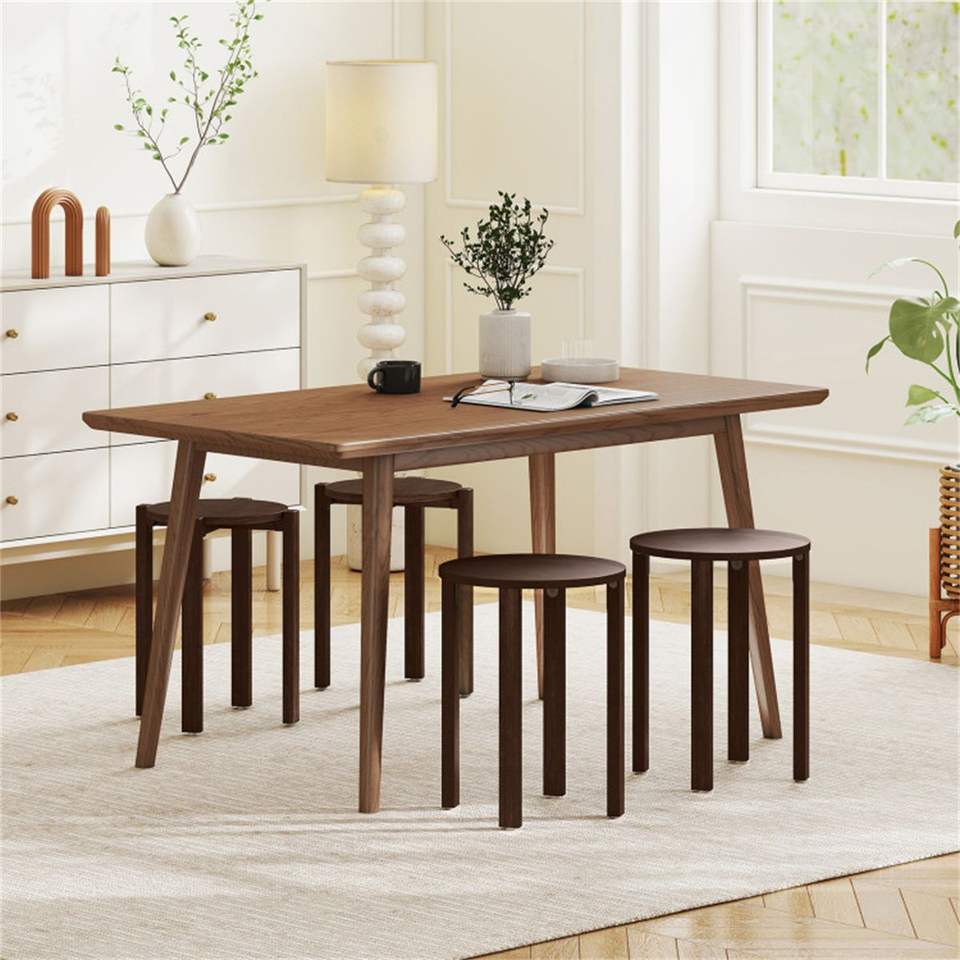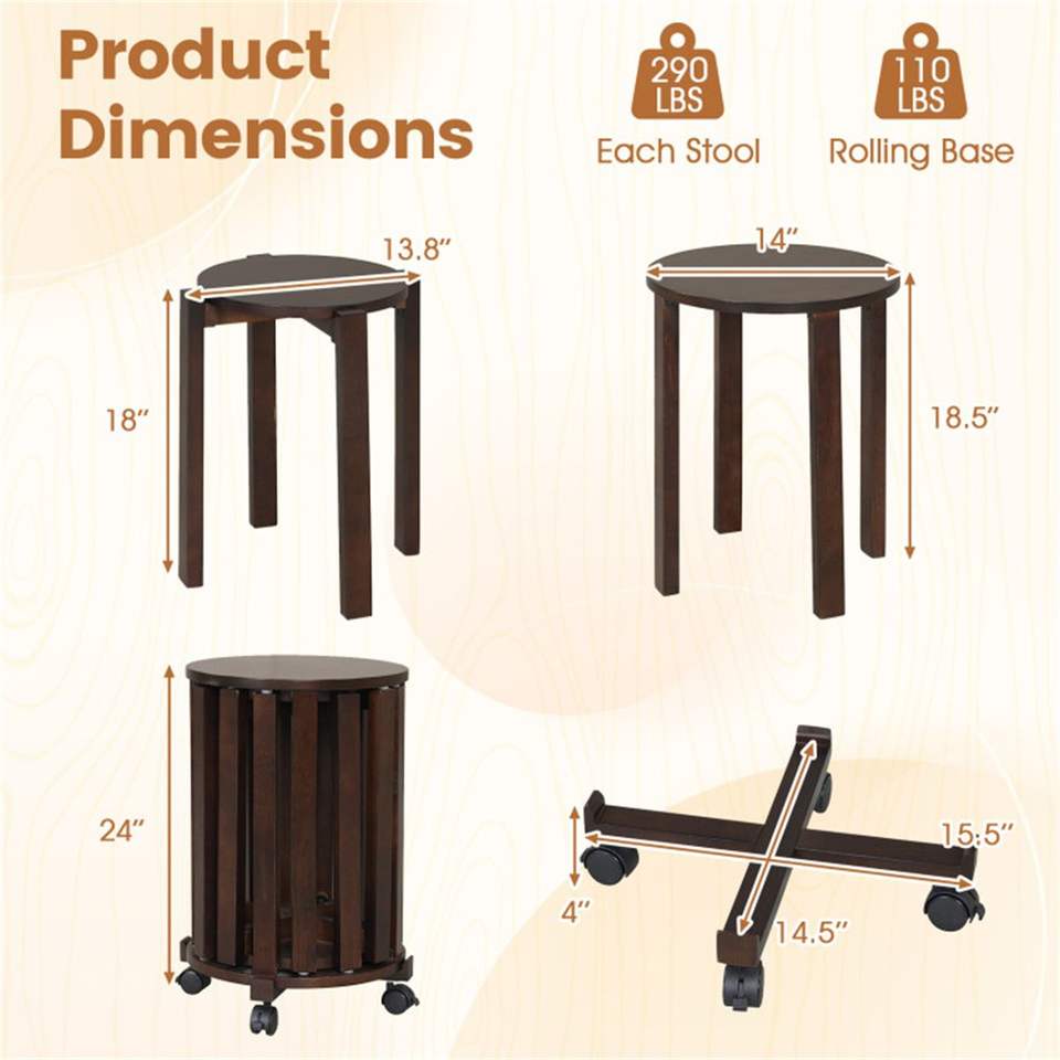4-Piece Nesting Stools Set Solid Rubber Wood Dining Stools Lockable Rolling Base Extra Seating Walnut Stackable Dining Room