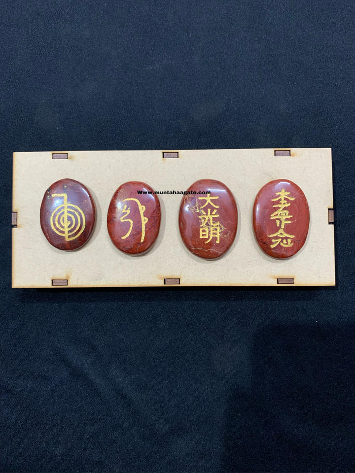 4-Piece Red Jasper Usui Reiki Set Premium Handcrafted Crystal Stones Engraved Oval Shape Spiritual Energy Healing Gift Product