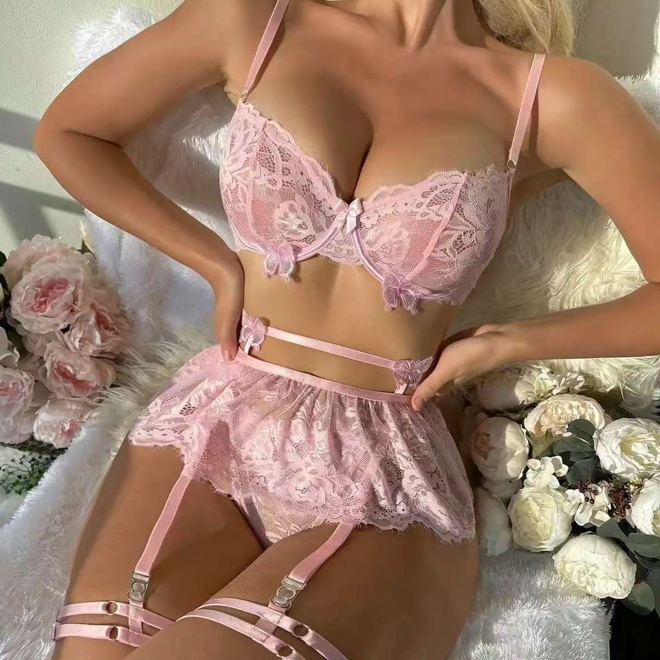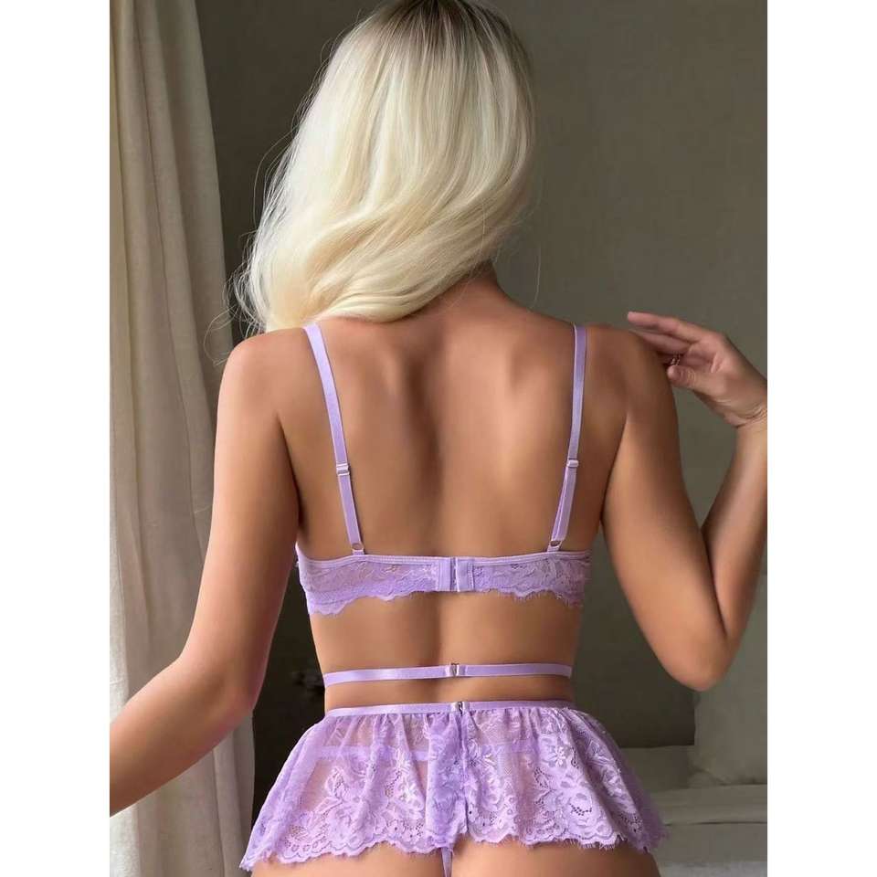 4 Piece Women's Strappy Lace Lingerie Set XL Size Transparent Pure Lust Bra Garter Thong Skirt Adjustable OEM Wholesale Export