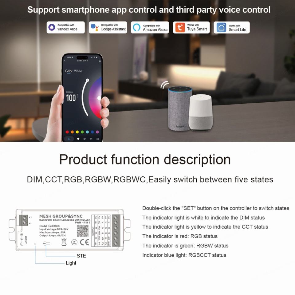 4 Zone 5-in-1 Remote Control for COB/SMD Light Strips with Sync/Music Wireless 30M Range DC5-24V 6A/CH
