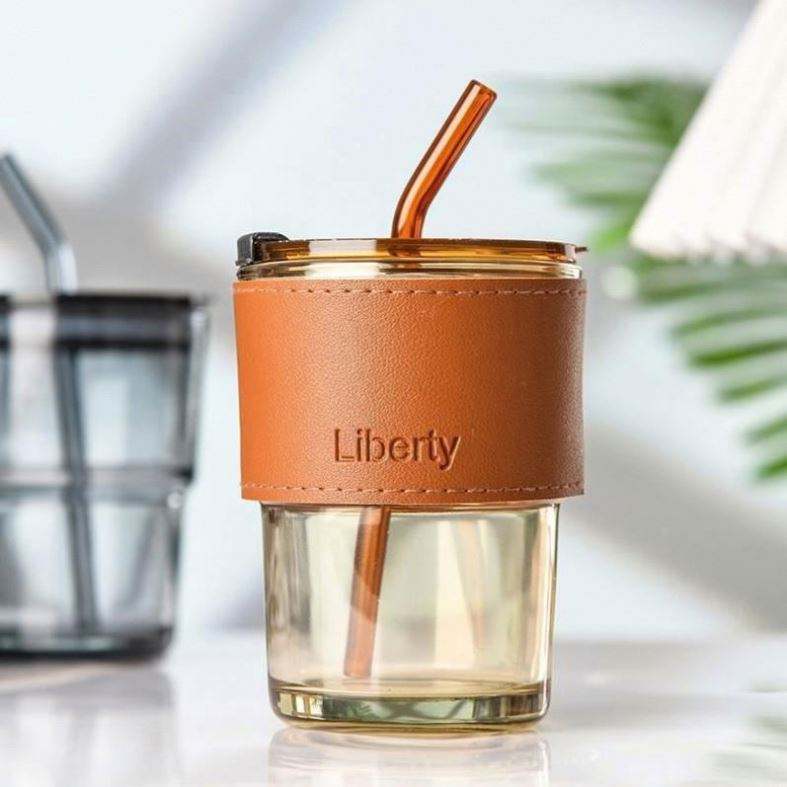400ml Bamboo-Styled Viral Coffee Milk Gift Cup with Leather Sleeve Heat Insulation Glass Straw and Washer for Restaurants Hotels
