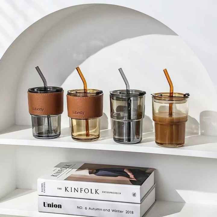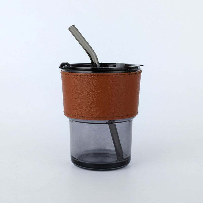 Gift Cup with Leather Sleeve Heat Insulation and Glass Straws