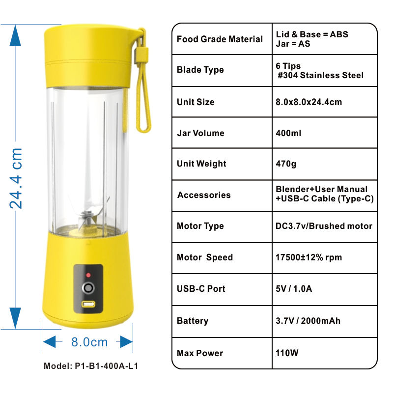 400ml Portable Juicer Rechargeable Wireless Juicer with Stainless Steel 6 Blade Orange Squeezer for Outdoor Indoor