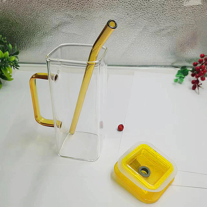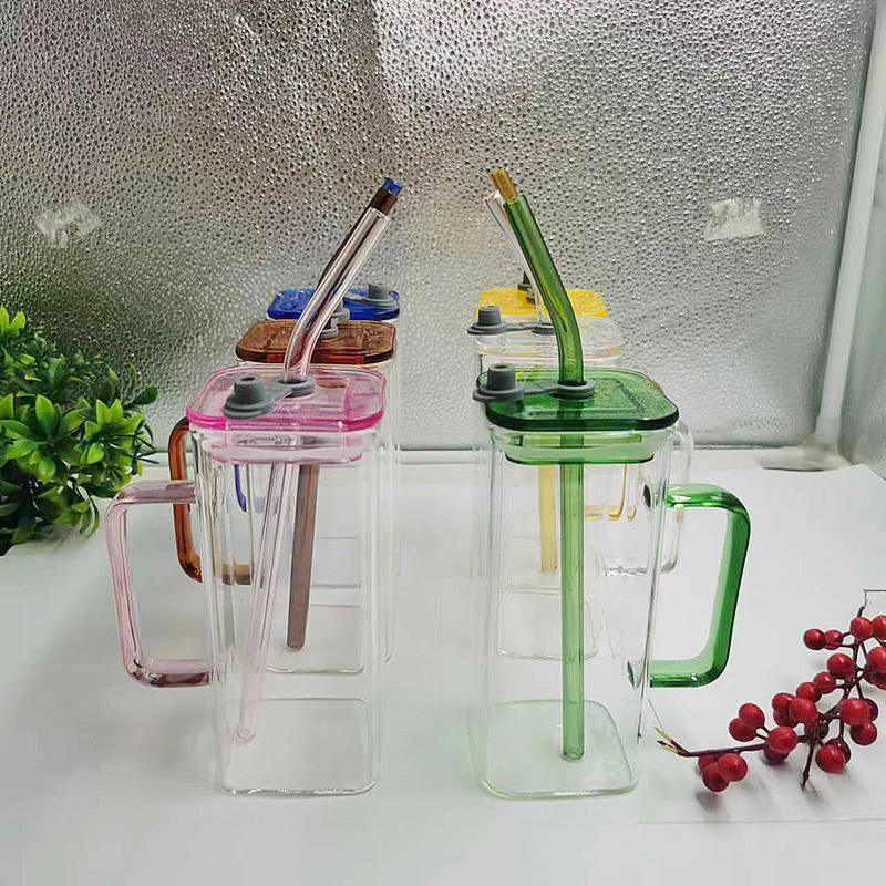 400ml Square Water Cup With Straw Silicone Lid Mason Jar Clear Colorful Handle High Borosilicate Glass Transparent Mug