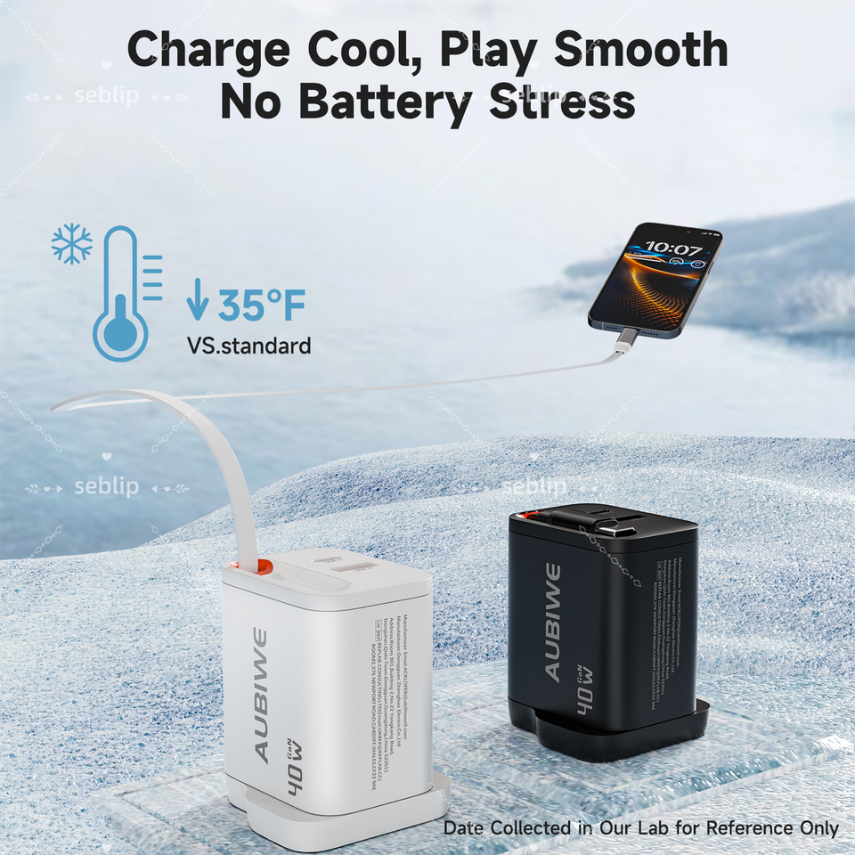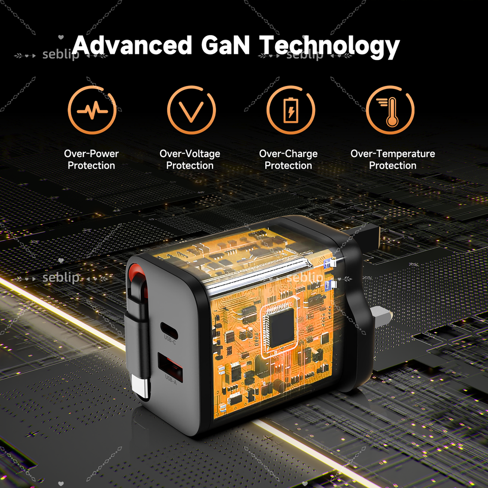 40W GaN Fast Charger UK Power Plug Retractable USB-C Cable 2 USB Ports Over-Voltage Protection PD 3.0 Laptop Phone Camera