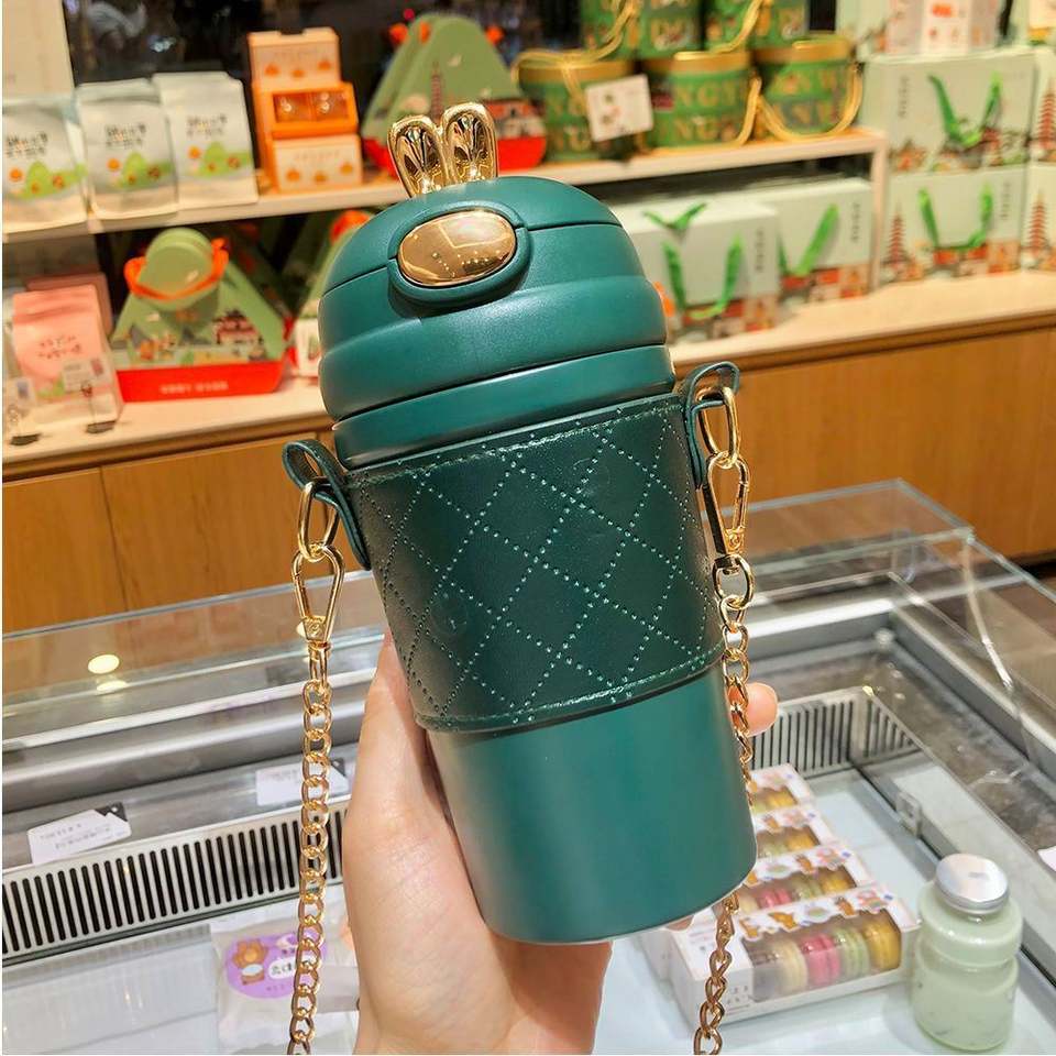 420ml Rabbit Ears Cute Stainless Steel Eco-Friendly Thermal Insulation Portable Kid Water Bottle Straw Pearls Metal Chain Strap