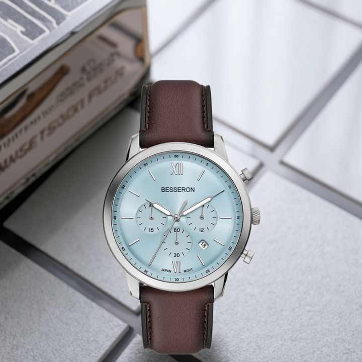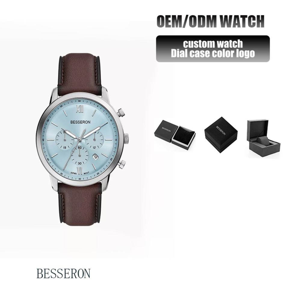 44mm Sports Chronograph Quartz Watch Japan Movt Stainless Steel Leather Strap 5ATM Waterproof Fashion Business Pointer Mens