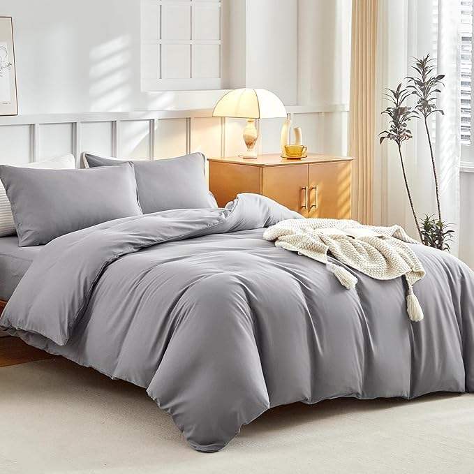 4PCS Bedding Set with Fitted Sheet Soft Microfiber Double Duvet Set with Pillowcases and Extra Fitted Sheet Solid Grey
