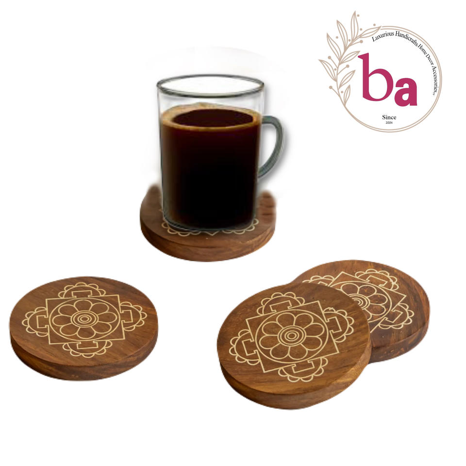 Set of 4 Classic Wooden Mandala Round Shape Coasters for Tea Coffee or Bar Cups Round Mug Table Mat Accessories
