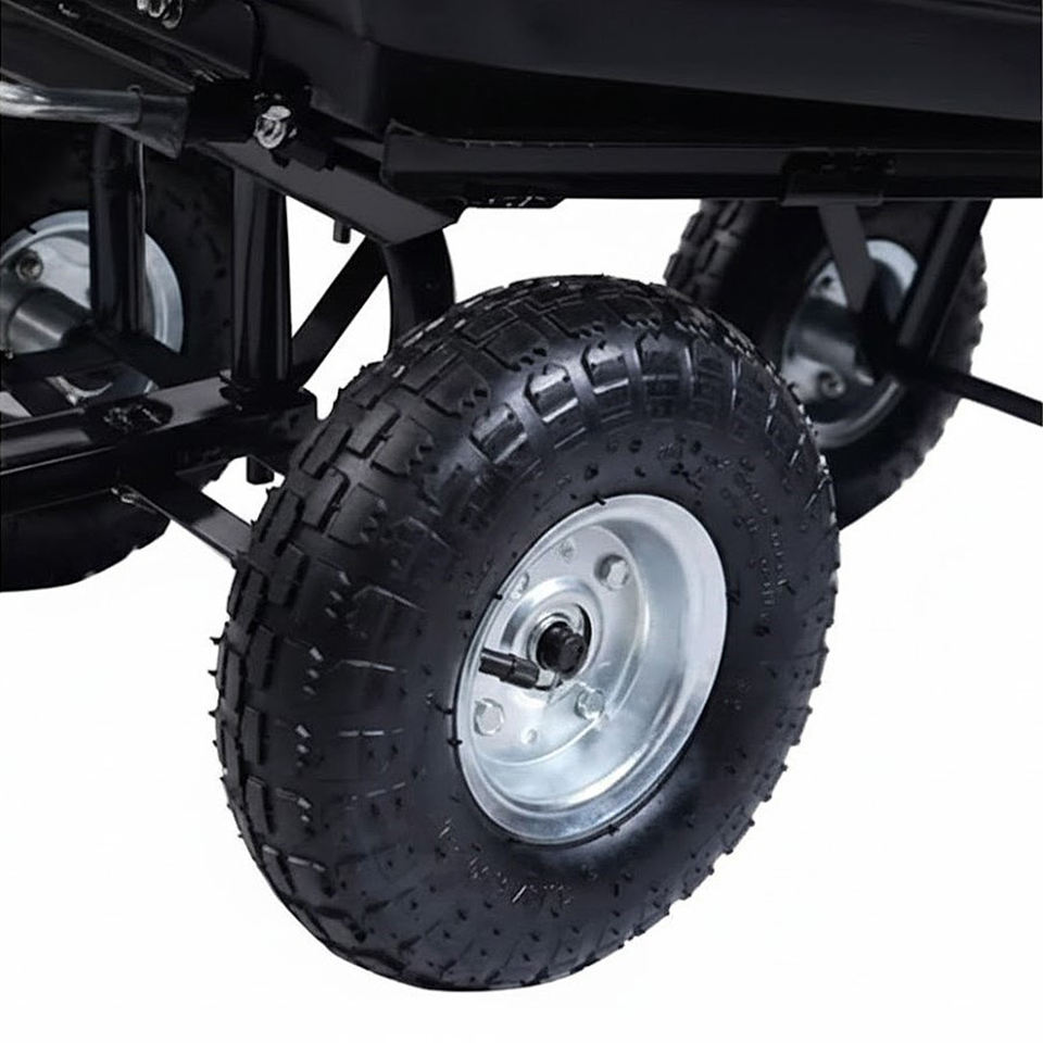Feature:Patented dumping mechanism, 10-inch pneumatic tires