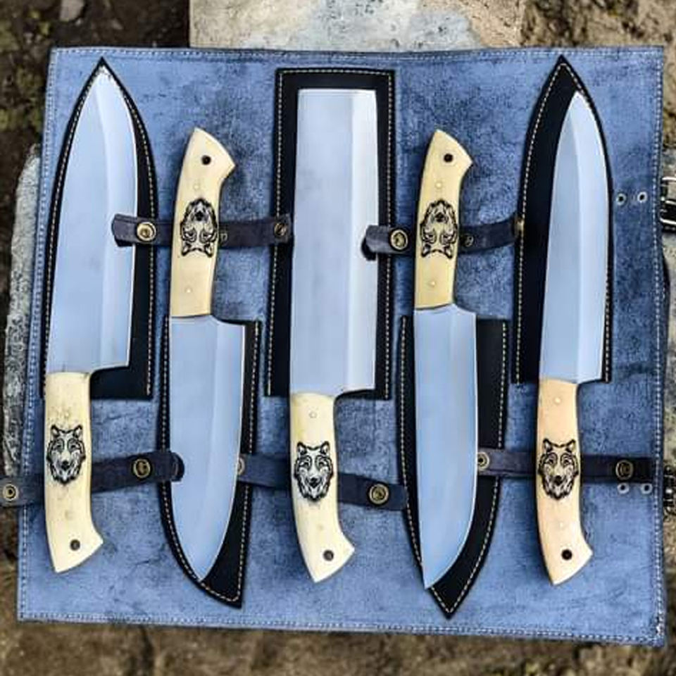 5-Piece Hand-Forged Chef Knife Set with Hammered Carbon Steel Blades and Wooden Handles