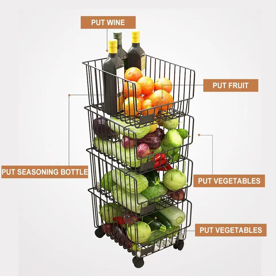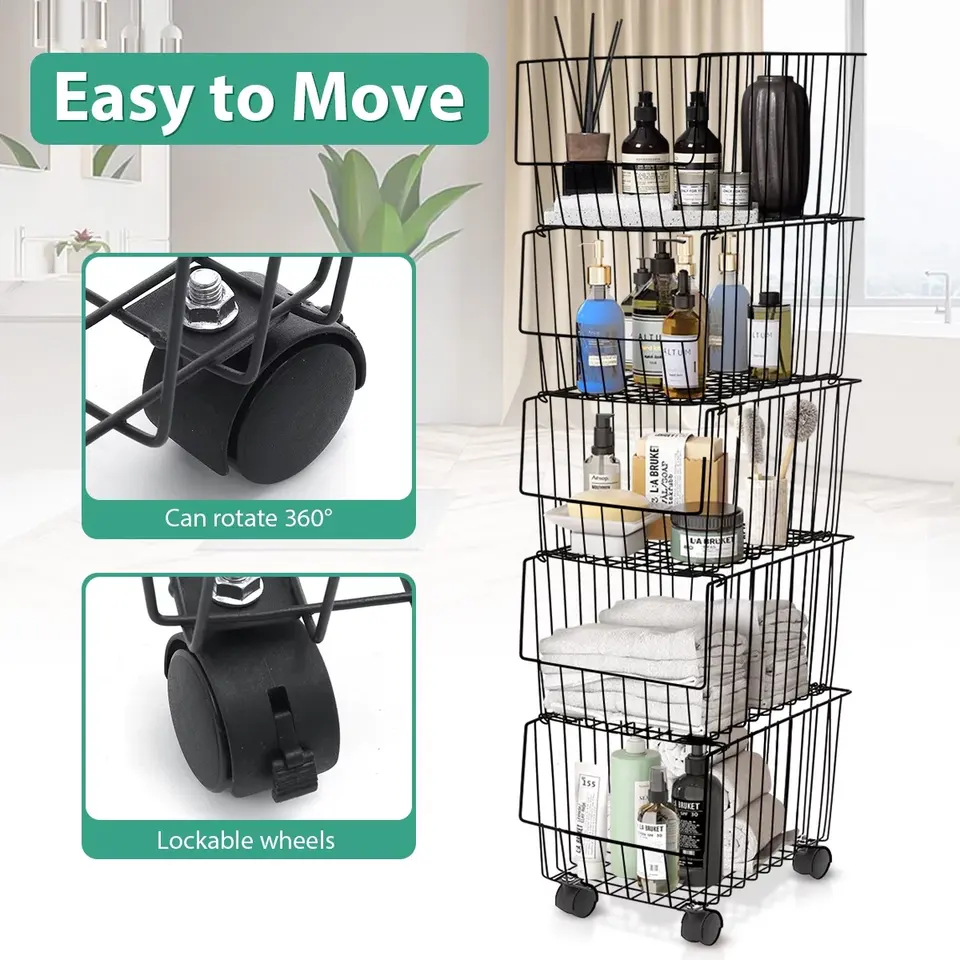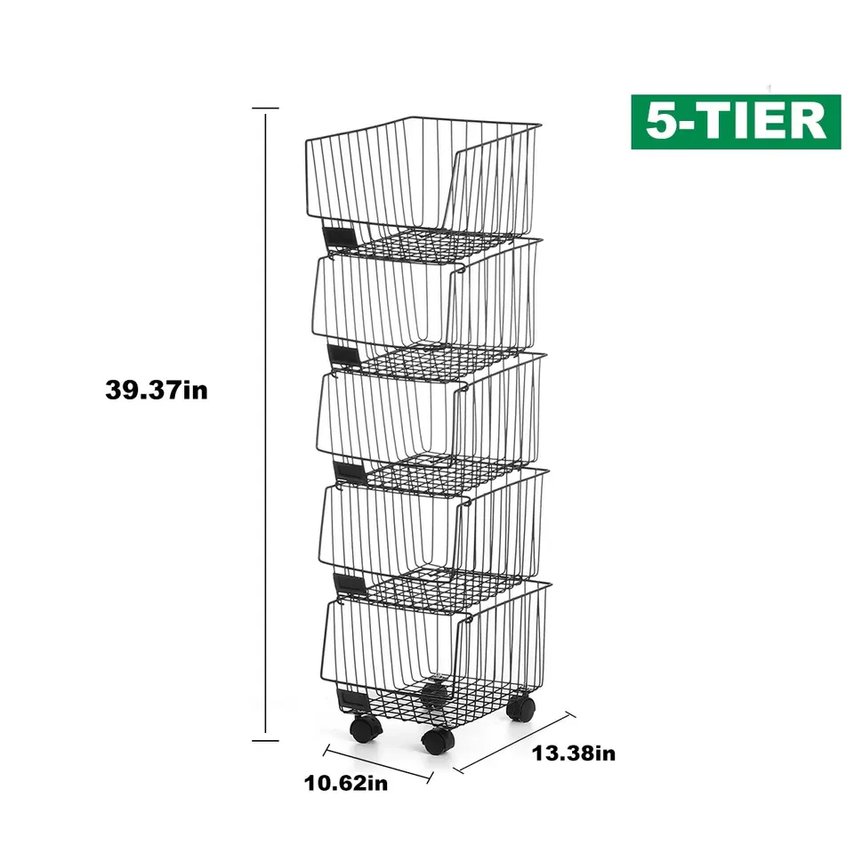 5 Tier Fruit Basket with Wheels Metal Storage Wire Stackable Storage Basket Organizer Utility Cart Shelving