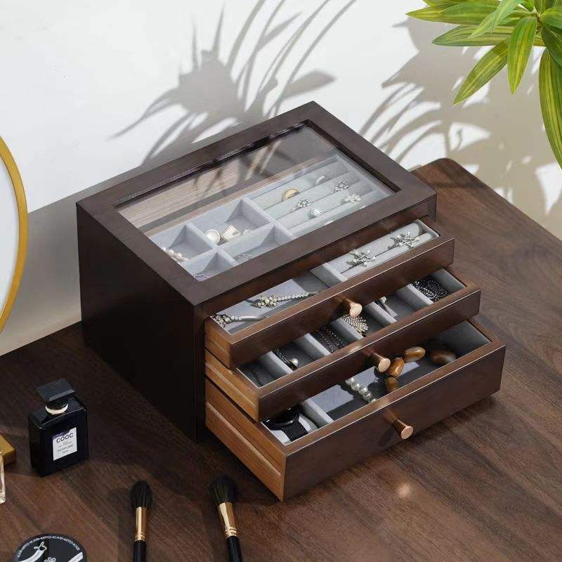 5 Tiers Solid Wood Jewelry Organizer Box with Glass Window for Storage and Displaying Necklaces Rings Earrings Bracelets