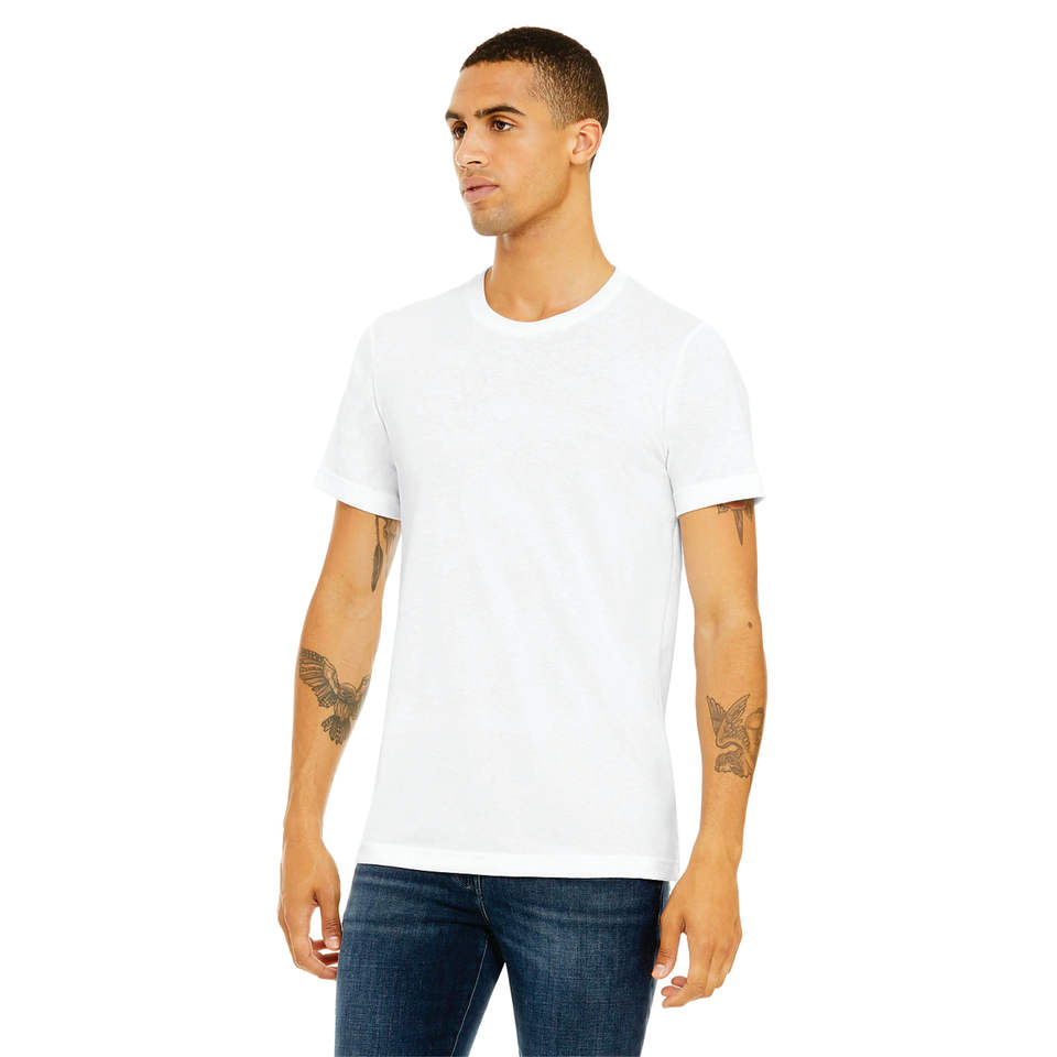 50% Poly 25% Airlume Combed and Ring Spun Cotton 25% Rayon 40 Single 3.8 oz Solid White Unisex Triblend Short Sleeves T-Shirt