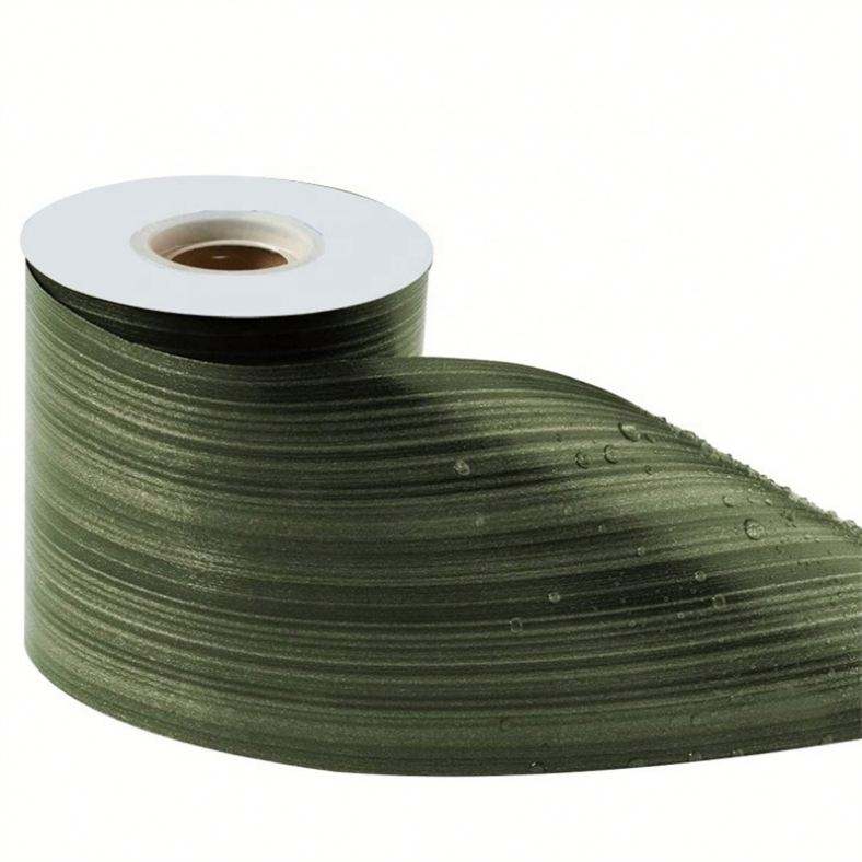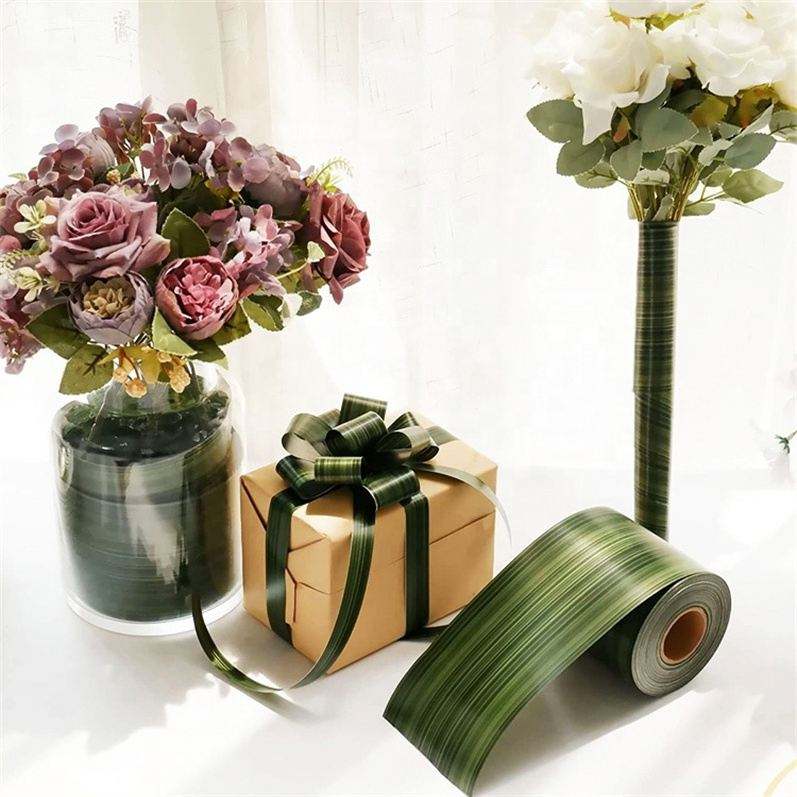 50 Yards Solid Satin Floral Wedding Decoration Bouquet Wrap Waterproof Green Ti Leaf Variegated Curling Plastic Ribbon Roll DIY