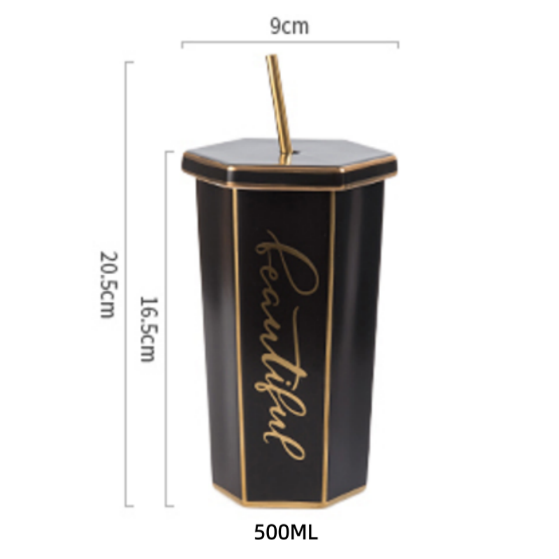 500ML Large Capacity Gold-Rimmed Ceramic Drink Cup Rhomboid Personalized Mugs With Ceramic Lid and Gold Straw