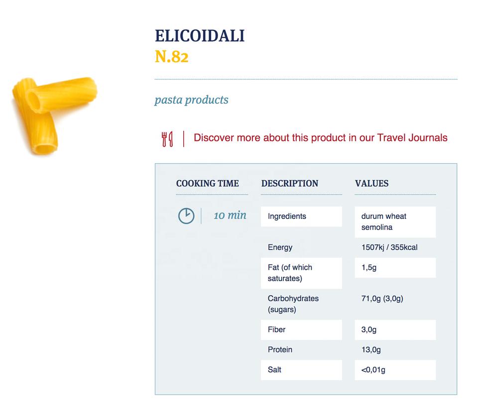 Primary Ingredient:Durum Wheat, 100% italian durum wheat
