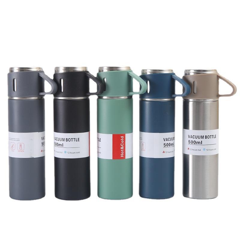 500ml 17oz Personalized Stainless Steel Vacuum Flask Set with Three Cups Custom Logo Thermal Water Bottle Gift Thermoses