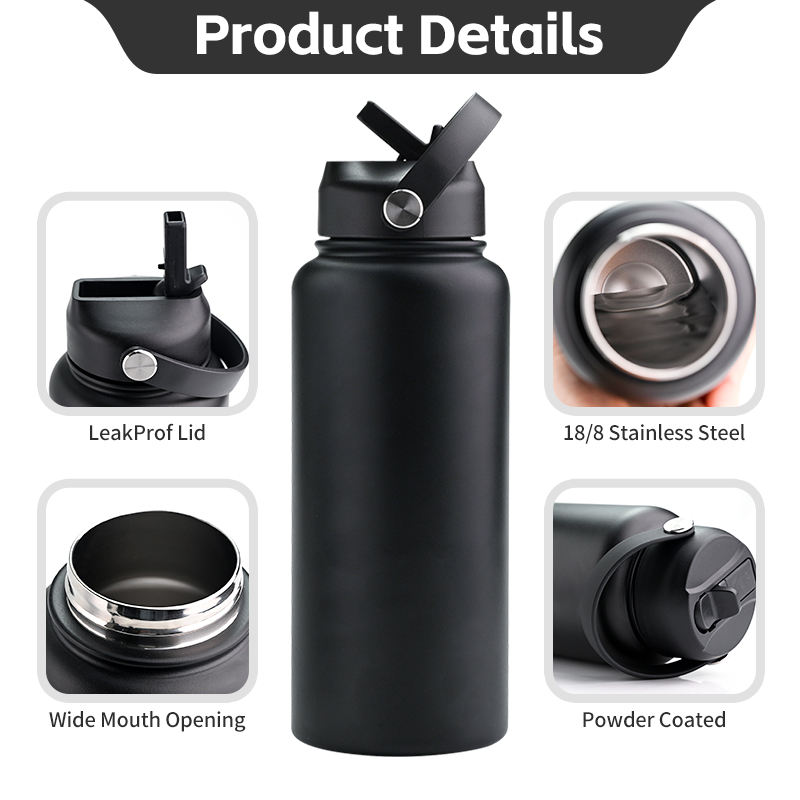 500ml 750ml 1000ml Wide Mouth 304 Stainless Steel Double Wall Sports Flask for Thermos Handle Straw with Spoon 32oz