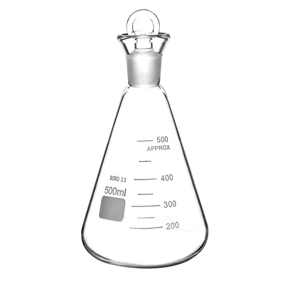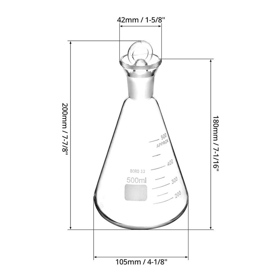 500ml Borosilicate Glass Erlenmeyer Flask Thick Wall 24/29 Standard Conical Outer Connection Heavy Duty Lodine Stopper 2-Year