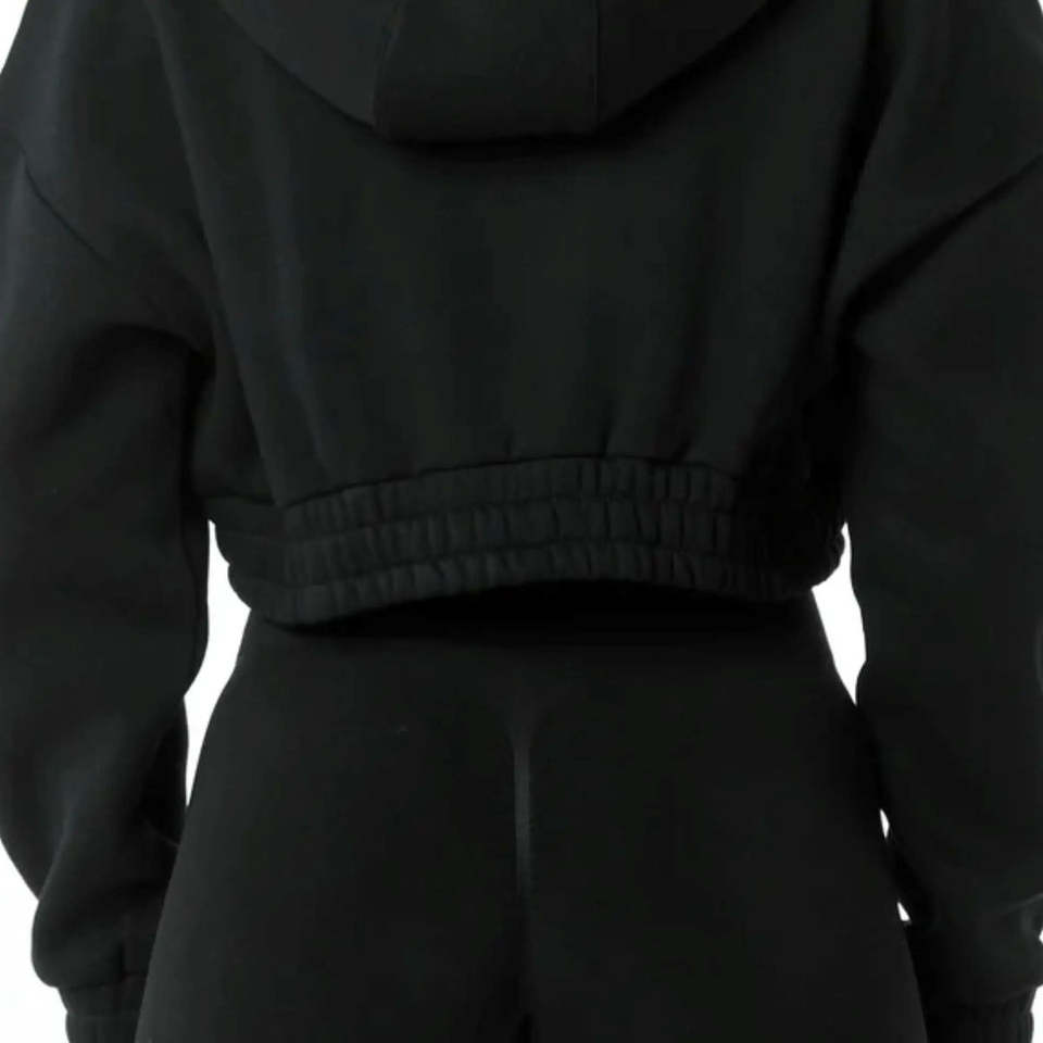 55% Cotton, 45% Spandex Drop Shoulder Style Oversized Cropped Fit Black Women Classic Capital Full-Zip Crop Hoodie