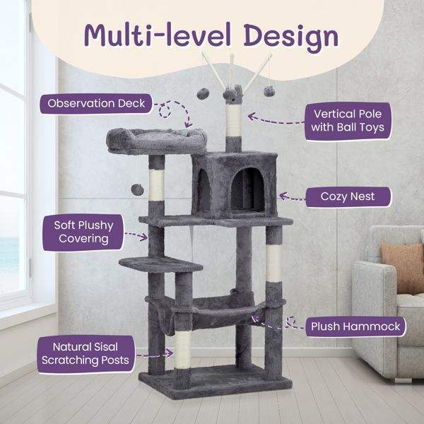 57-Inch Cat Tree Tower with Padded Platform Bed and Toy Balls Large Cozy Indoor Cat Condo with Sisal Scratching Mat