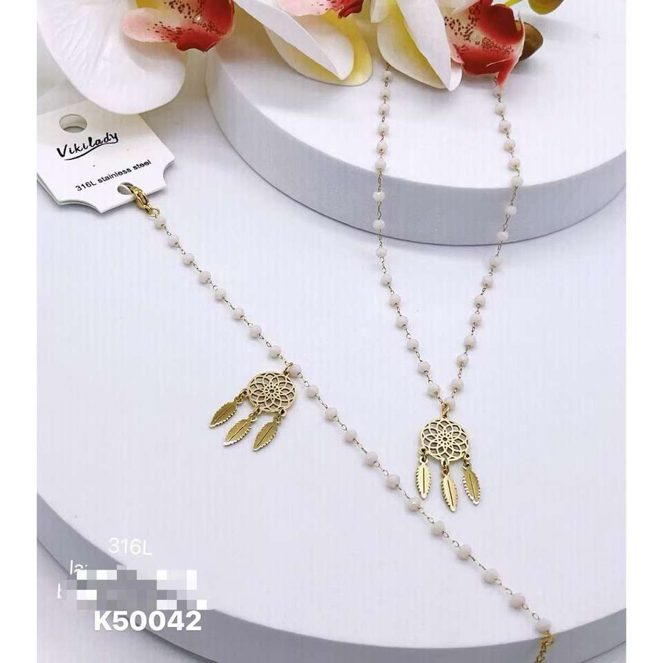 585 Gold Plated 316L Stainless Steel Beige Crystal Bead Dream Catcher Necklace + Bracelet Set Polish Physical Fashion Jewelry