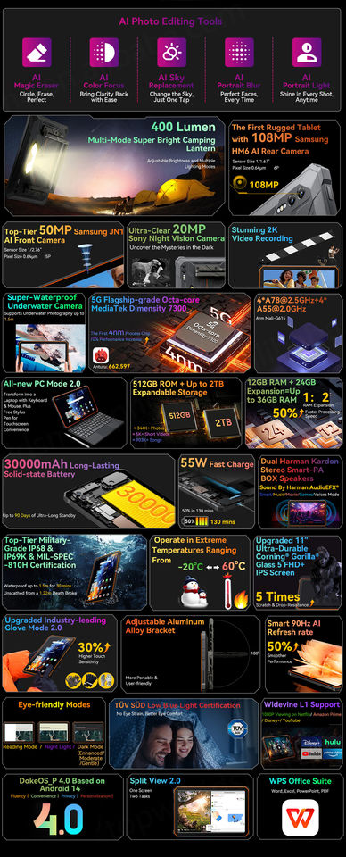 5G Pad 108MP Main Camera 20MP Night Vision Camera 30000mAh Android 14 Global Rugged Tablet PC Blackview Active 10 Pro 12+512GB