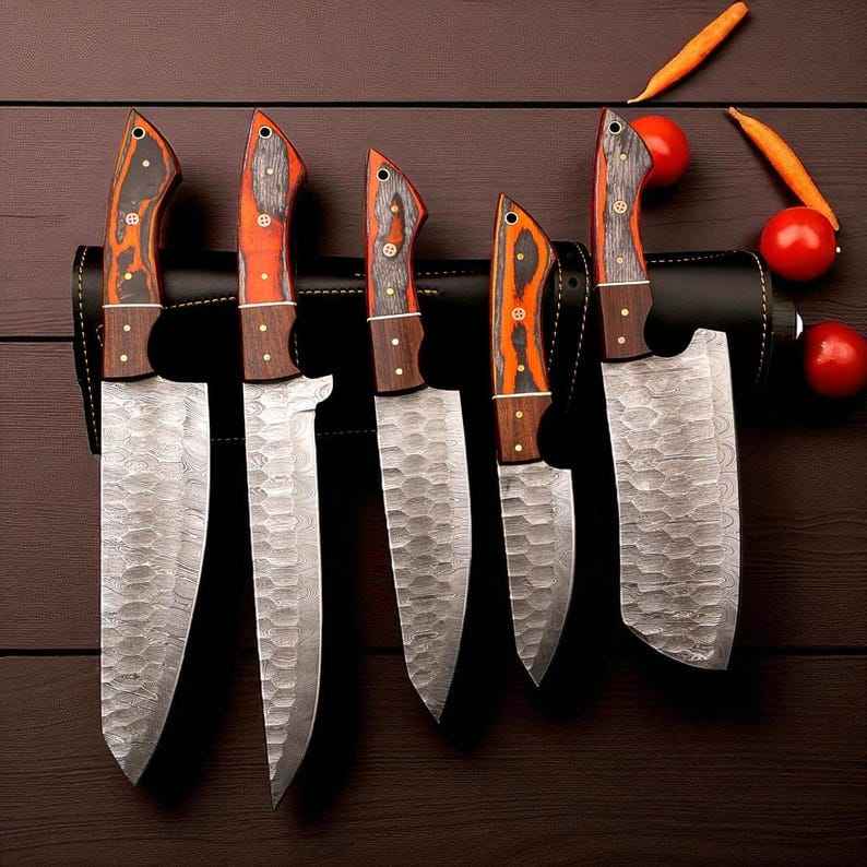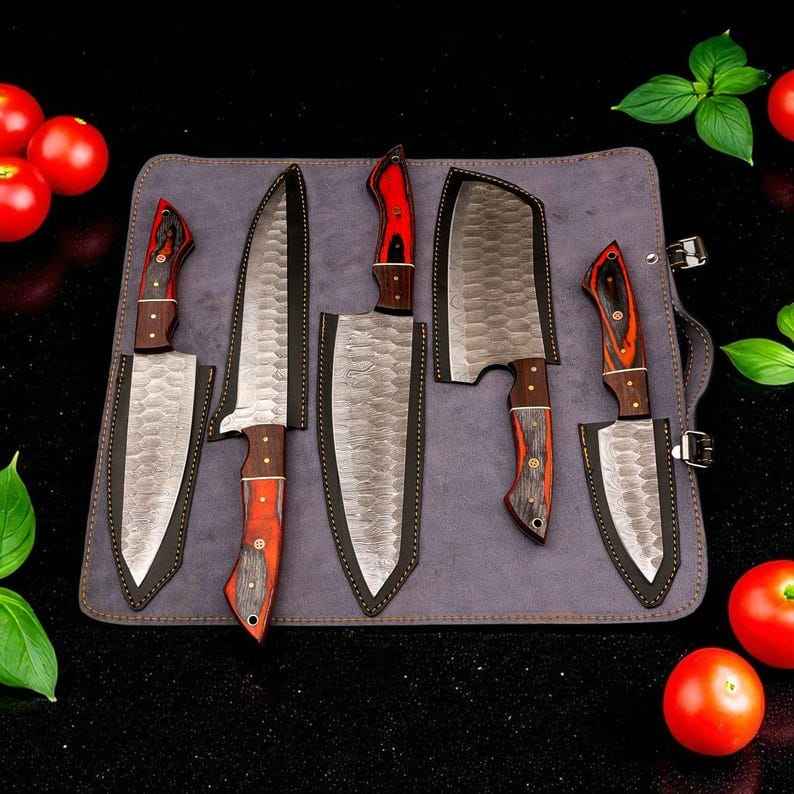 5PCS Chef Knife Kitchen Knives Set Damascus Steel Blade Chef Set Beautiful Kitchen Set Resin Handle With Leather Sheath