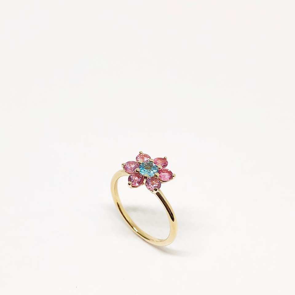 5mm Aqua Blue Cut Diamond Flower Ring Pink Diamond Petals 18K Gold Plated Sterling Silver Minimalist Custom Fashion Jewelry