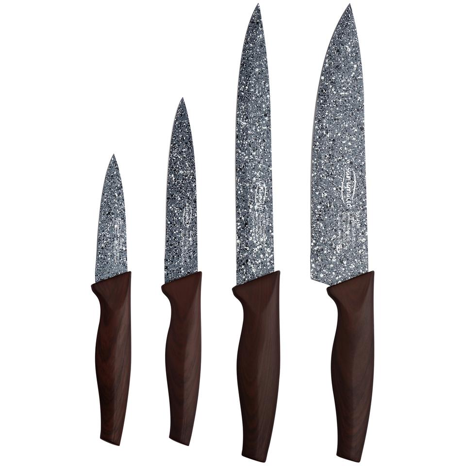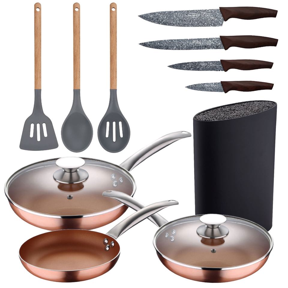 5pc set of pressed aluminum frying pans (with lids) induction compatible with 3pc set of silicone and wooden kitchen utensils,