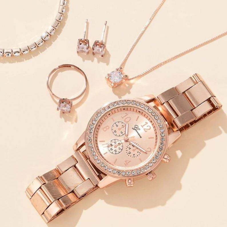 5pcs/set Titanium Alloy Strap Women's Fashion Korean Quartz Watch with Spiral Crown (Suit in Orange Box)