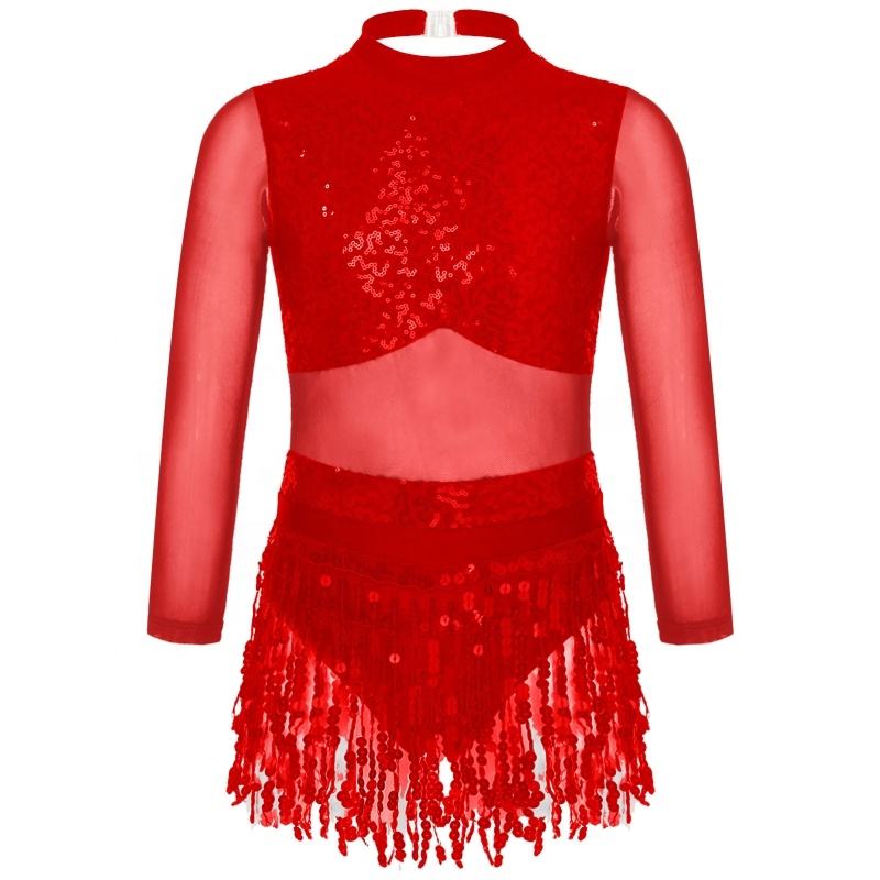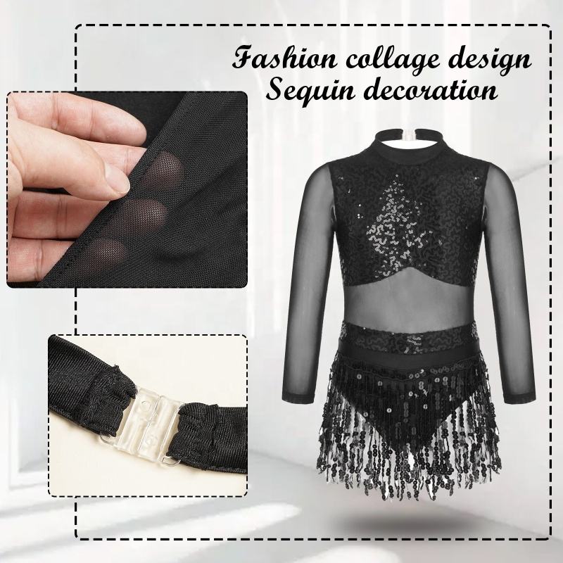 6-16 Kids Dance Costume Performance Wear Girls Latin Dancewear Stylish Long Sleeve Sequins Style Tassel Dance Dress