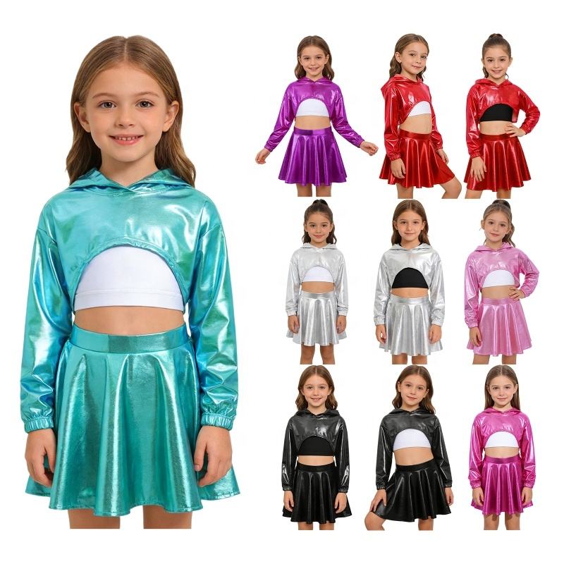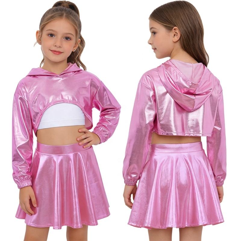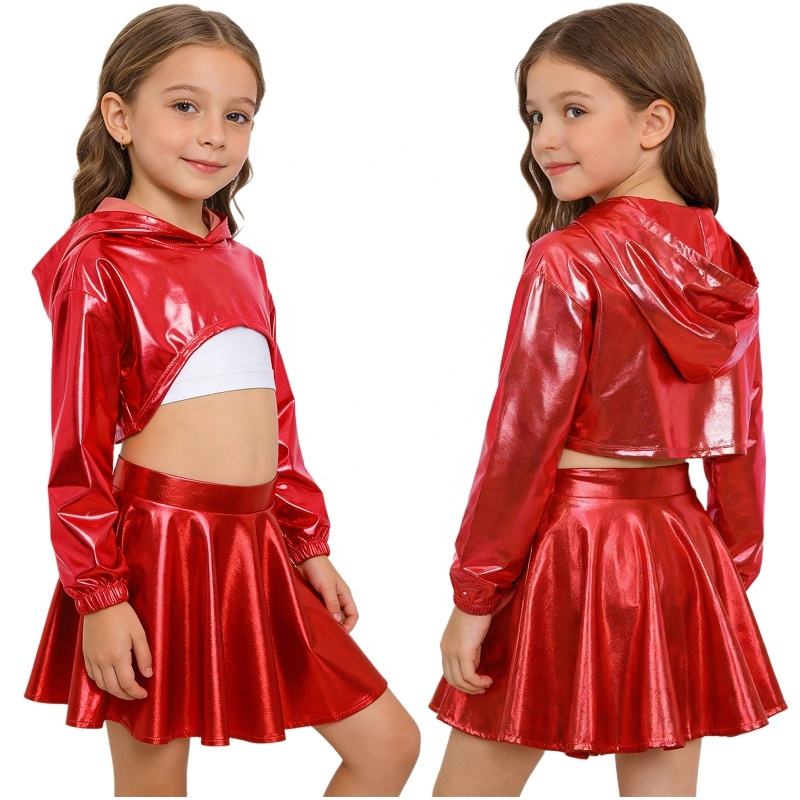 6-16 Kids Girl Hip-Hop Jazz Dance Costume Metallic Hoodie With Vest And Skirt For Classes Performances Girls Dance Practice Wear