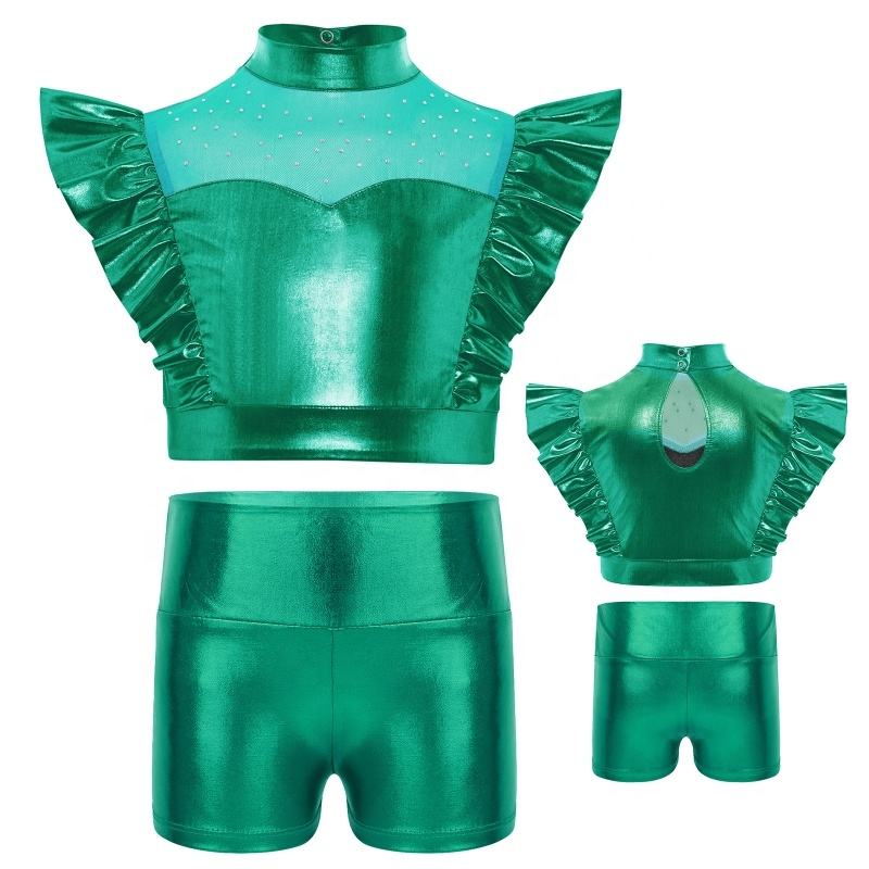 6-16 Kids Girls Jazz Dance Outfit Metallic Ruffle Crop Top With Shorts Sets Hip-Hop Recitals Wholesale Ballroom Conempary Dance