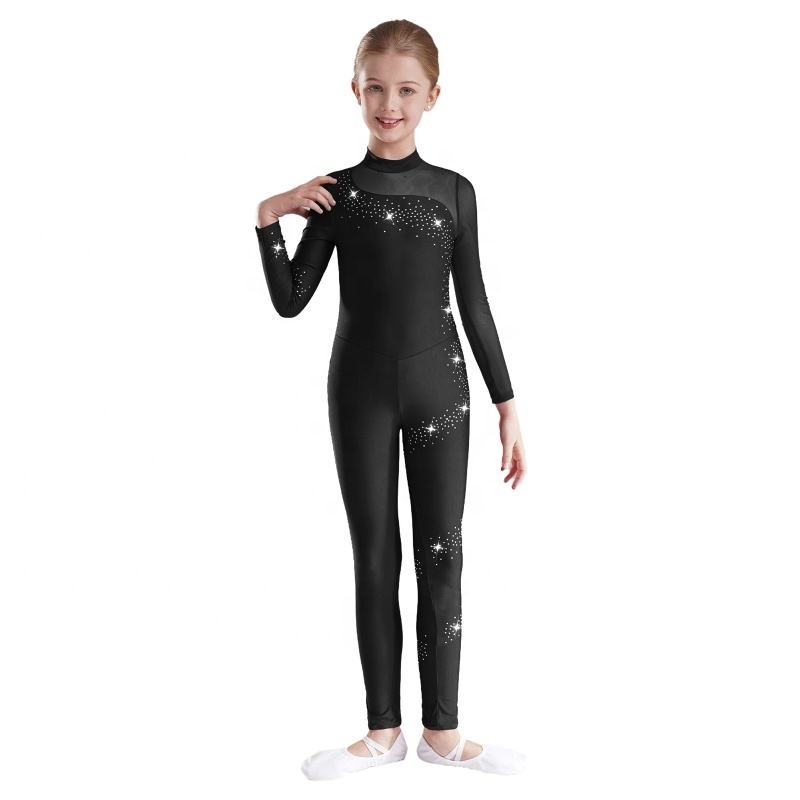 6-16 Kids Girls Jumpsuit Rhinestones Bodysuit Stage Dance Wear Figure Skating Gymnastics Clothing Dance Costume