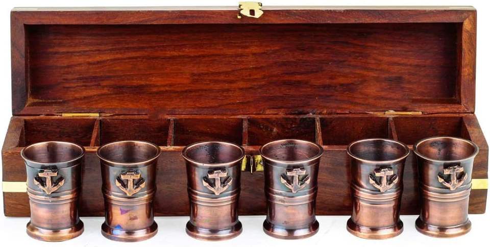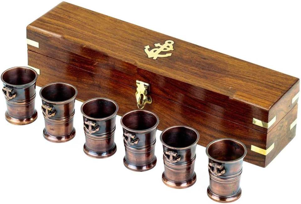 6 Brass Antique Shot Glasses Hotel & Bar Wine Drinking Shot Glasses with Anchor Wooden Box Nautical Beer Glass Set of 6 Bar-Ware